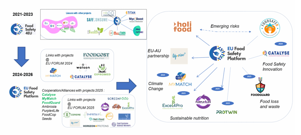 The European Food Safety platform, coordinated by the CNR ISPA – Institute of Sciences of Food Productions of the National Research Council, was officially launched on the World Food Safety Day 2023, being co-designed and developed by the FoodSafety4EU project partners. The network was formalized in Brussels in 2023 during the EU FOOD SAFETY FORUM through the signature of the Terms of Reference by a first nucleous of 23 organizations belonging to the FS4EU Consortium, thus giving rise to the multi-stakeholder "EU FOOD SAFETY PLATFORM." Starting from Bari, the platform was launched with the participation of EFSA, the Metropolitan City of Bari, CNR, and other international institutional representatives (JRC-EC, SCAR Food System). In 2023, the platform was showcased during the European Food Safety Forum in Brussels and at the FS4EU project stand during the FOOD2030 Conference, upon invitation by the European Commission. This event initiated preliminary contacts with some representatives of the European Parliament and other European networks. After the end of the project, the platform continued its journey by establishing a legal entity, fostering new initiatives at EU, National and Regional level, and continuing to present and exploit the main results in international workshops and conferences. Several alliances with EU running projects are supporting the scientific and networking action of the Platform, thus boosting food safety engagement in several domains addressed by: MyMatch, FoodSafeR, Holifood, Up-Rise, Purple4life, Foodguard, Titan, Catalyse, Trustfood, Excel4PRo and Protwin.